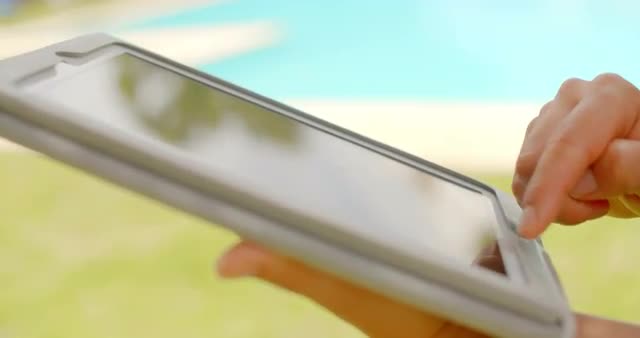 Woman Typing on Tablet Device in Swimming Pool Area at Slow Moion Video