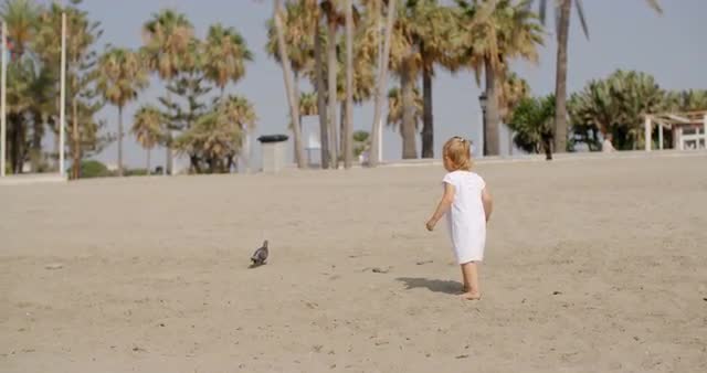 Curious little girl approaching a seagull on the beach in the summer sunshine with tropical palm trees in the background