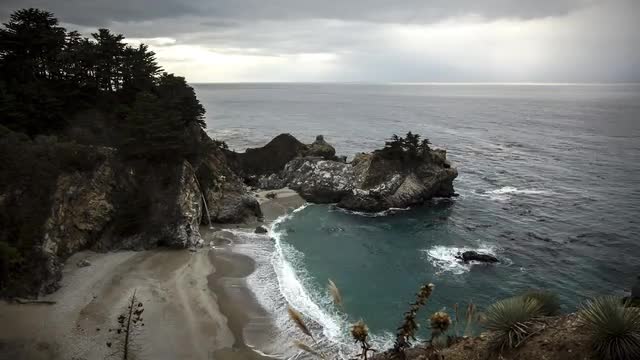 In this timelapse sequence, the camera move left to right in front of subtle foreground elements. In the background, the ocean is waving and water fall is falling. The clouds in this scene move through the sky and provide diffuse lighting on the scene.