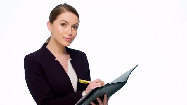> Happy Young Business Woman Making Notes and Smiling