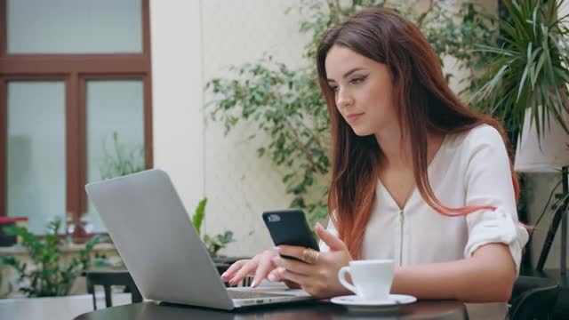 Young people working with laptop and smart phone while drinking tea in a cafe. There is no time to talk