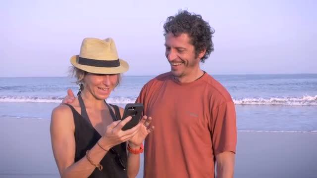 Close-up shot of a young man showing photos or video to the woman using smart phone. they talking and smiling while looking at the screen