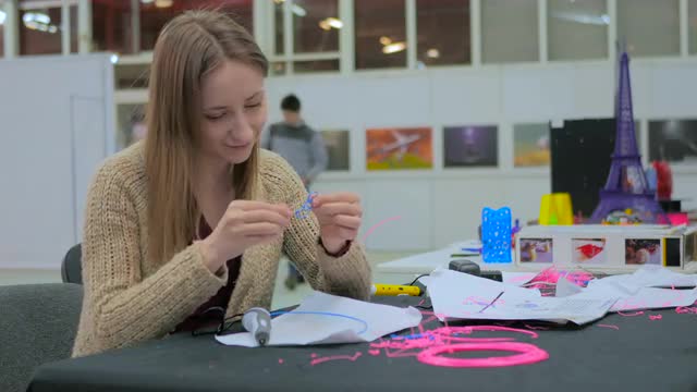 Close-up shot of a woman trying to draw with 3D pen on sheet of paper. She having sun, heart and word Expo done. Presentation of new 3D technologies