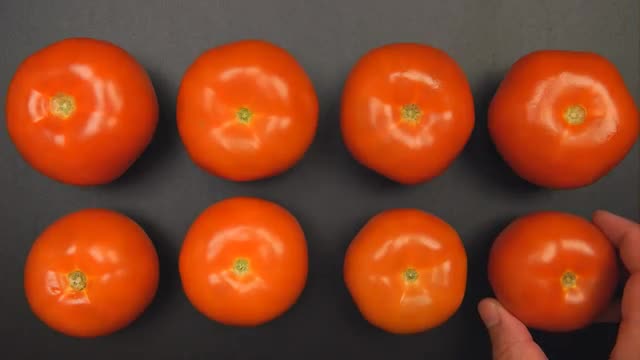 366631 - Human hand puts down last red tomato on a table
