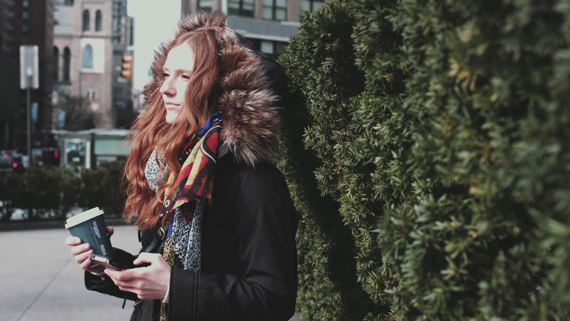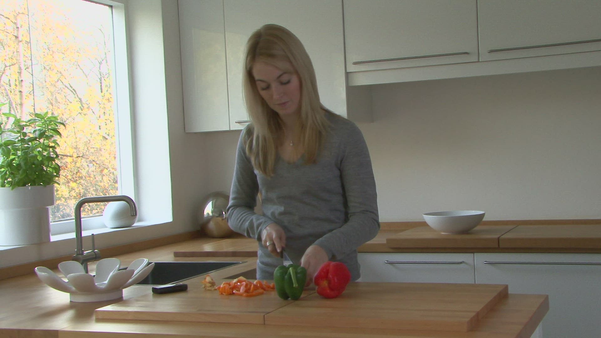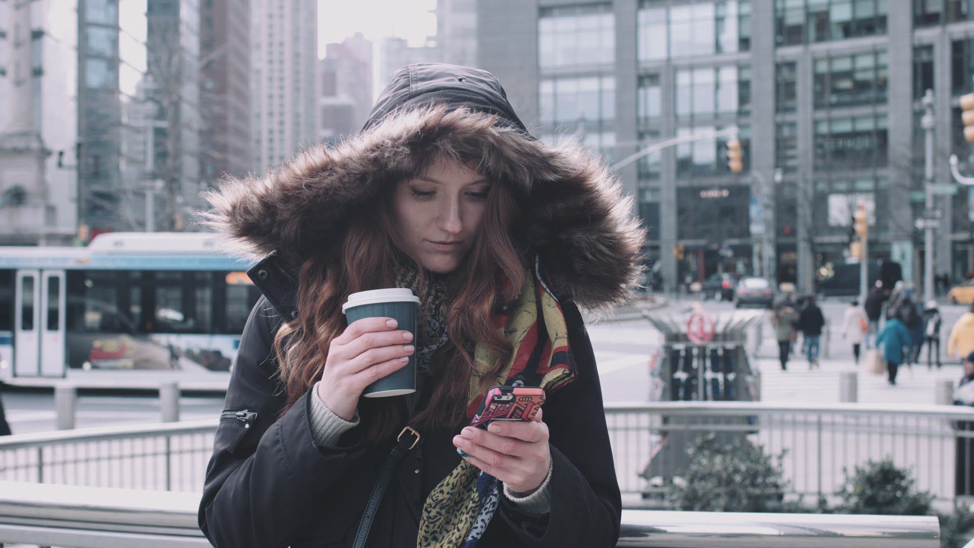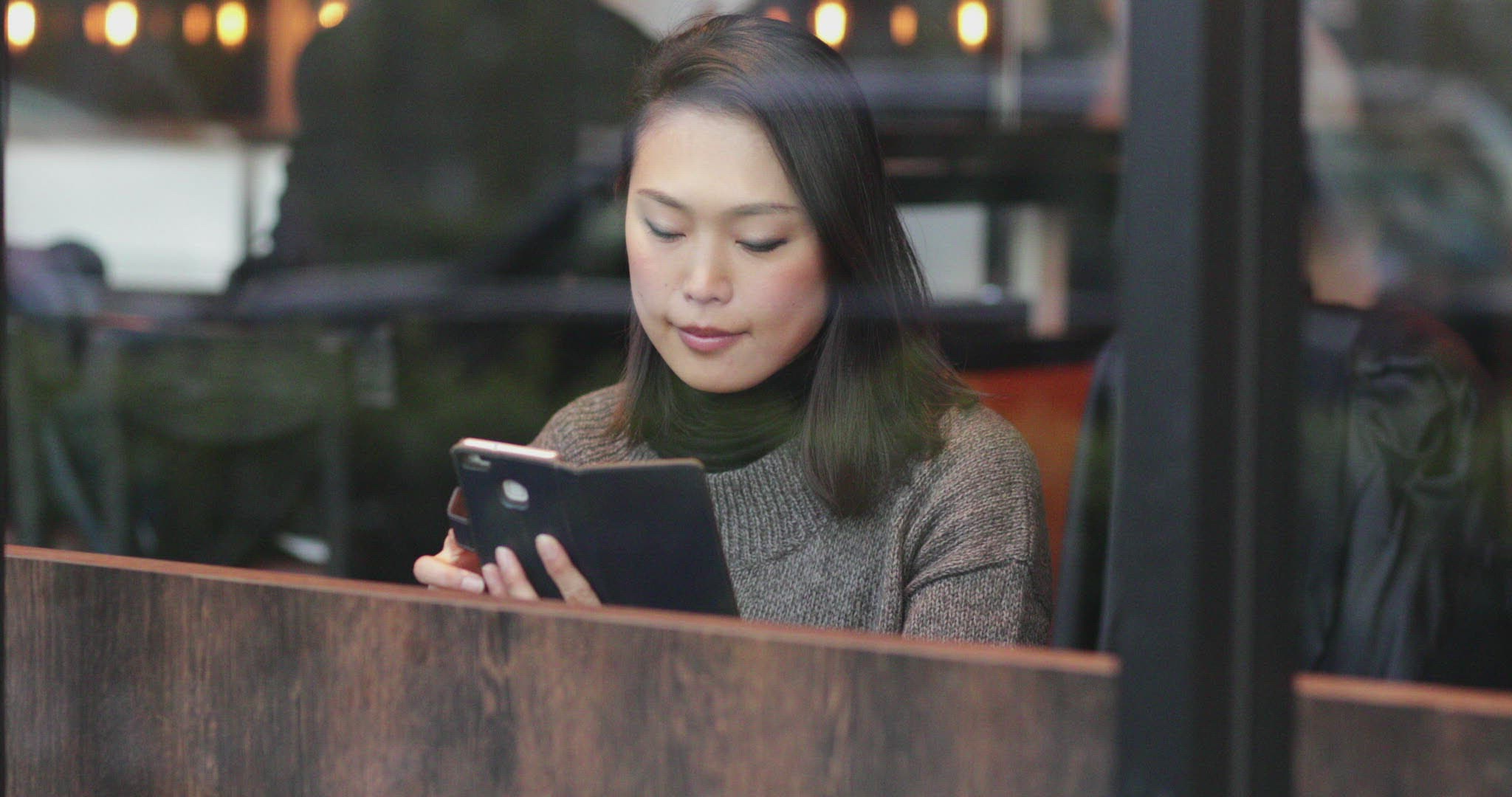 Closeup shot of a plate with food on the table, smartphone is lying by it. Woman is eating and scrolling touchscreen.