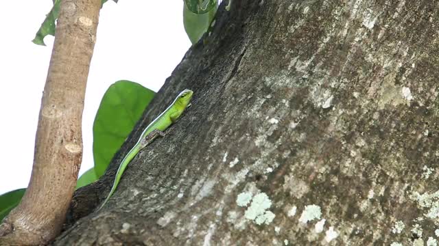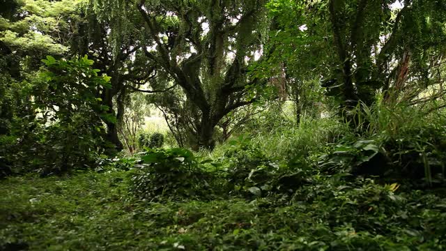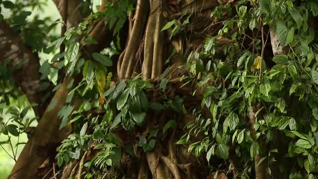 Camera tilts down looking at red tree vines wrapped around tree in the sunlight