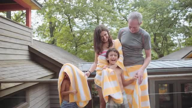 697766 - Mixed Race boy and mother at cabin throwing water balloons