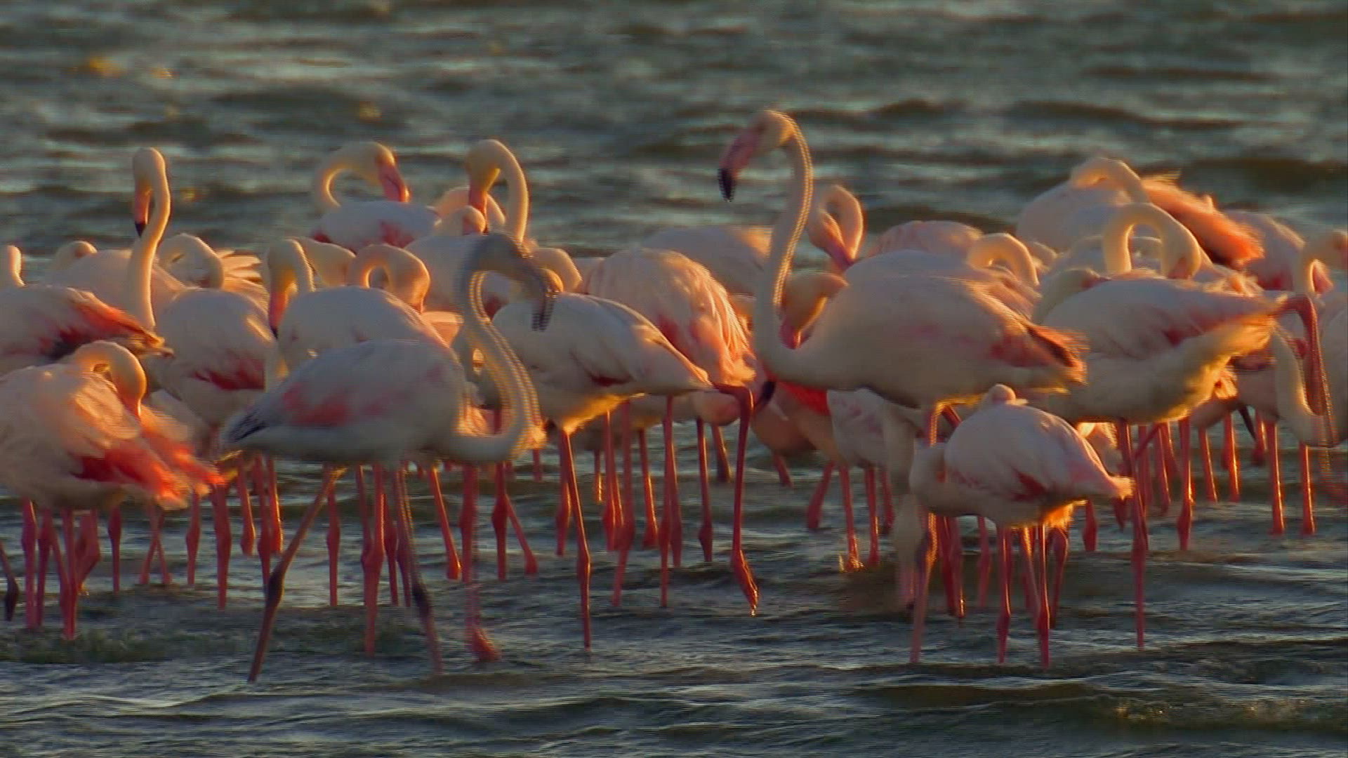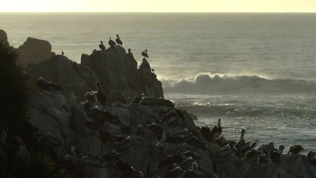 Pan shot of pelican flying across water in front of sunset