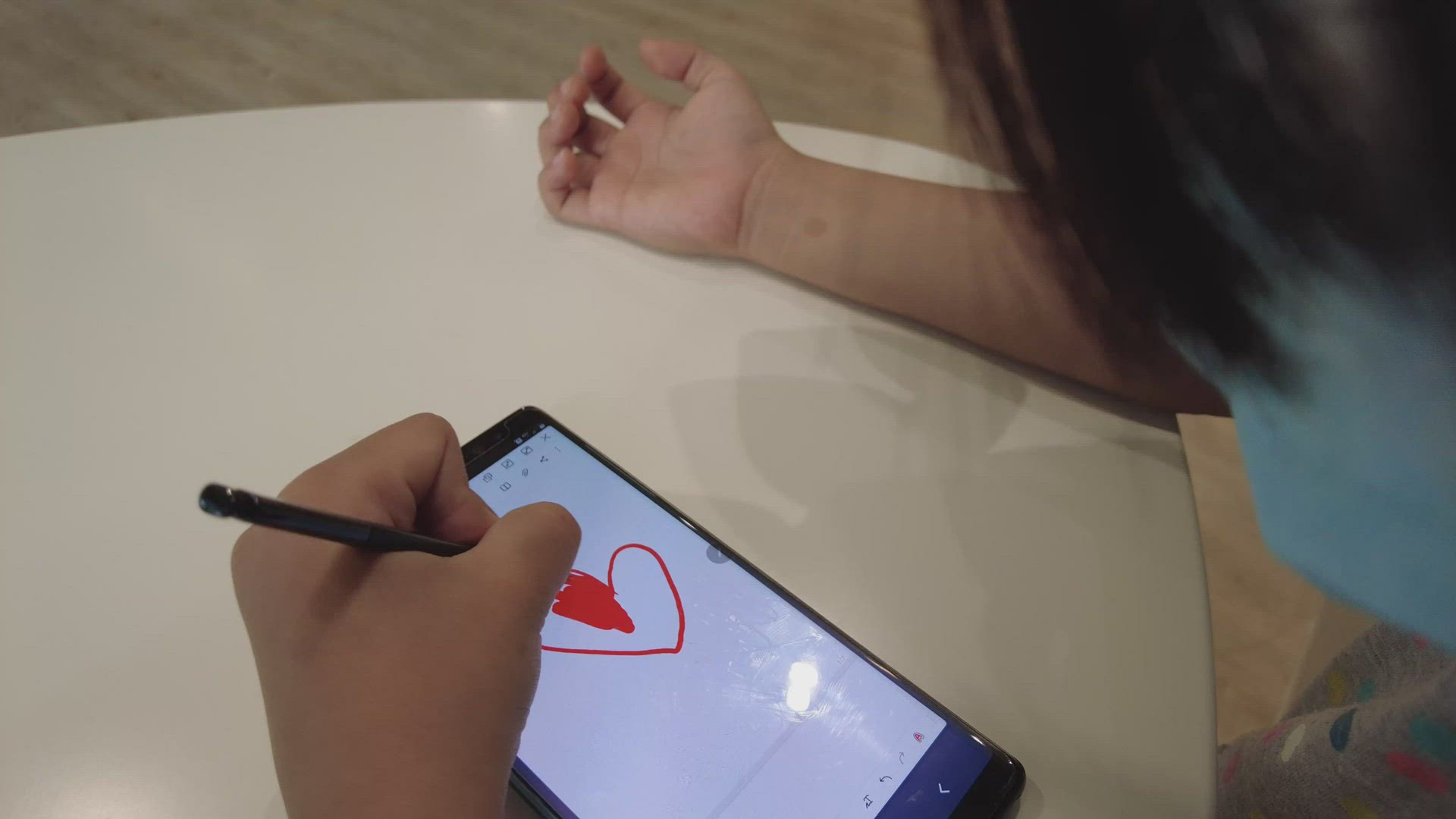 2129828 - Top view little girl wear face mask color red love shape with stylus pen