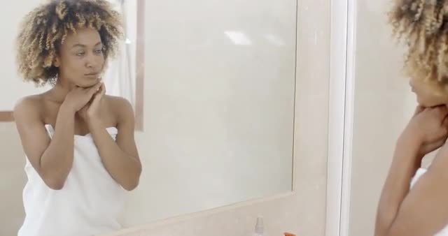 Woman viewing herself in the mirror in the bathroom