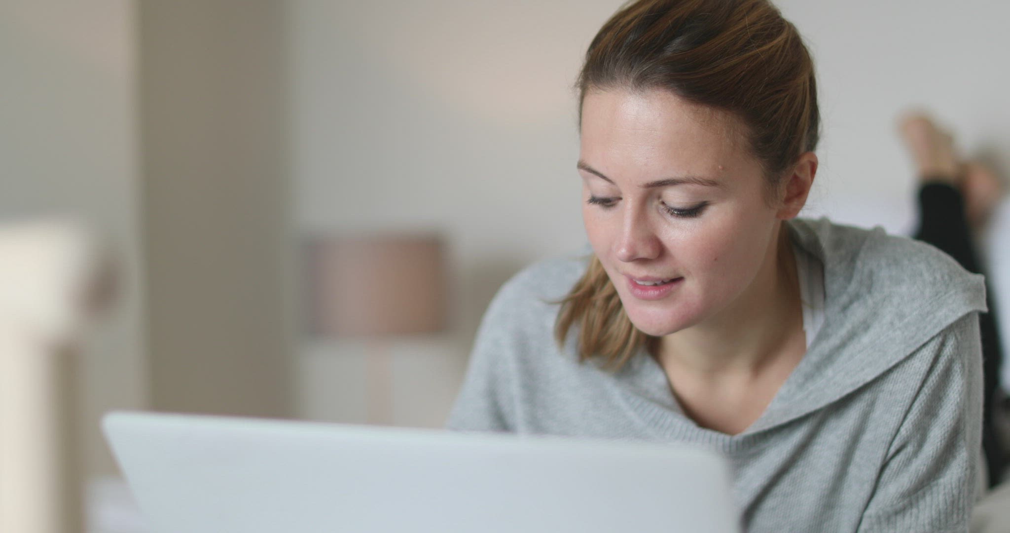 403966 - Beautiful young woman lying on sofa and working on laptop computer
