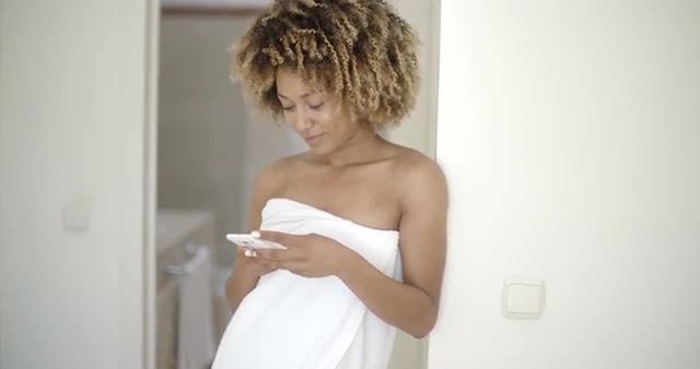 Young woman with towel on her body using phone in the bathroom