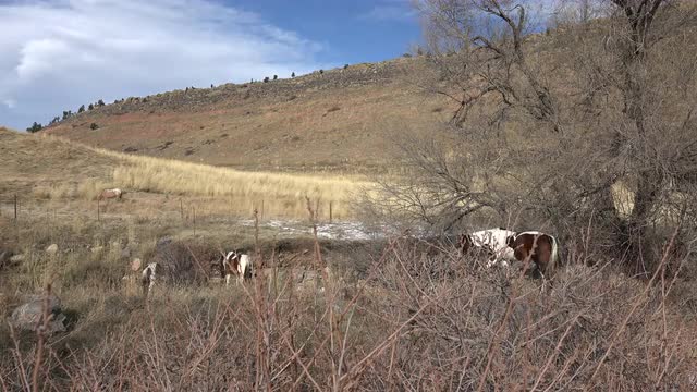 Horse grazing a light snow covered grass under watch from the compound above.