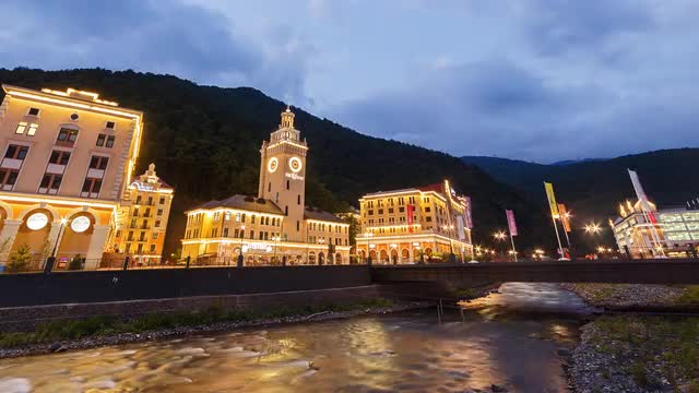Shelter Pandas at sunset. TimeLapse. Rosa Khutor. Sochi, Russia. 4K