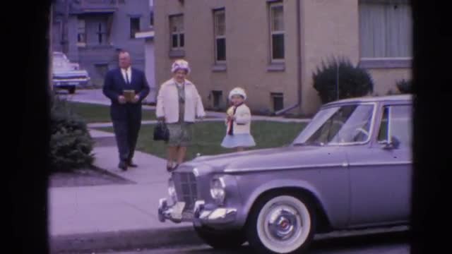 > 1957: Family exiting car coming home from morning at church.