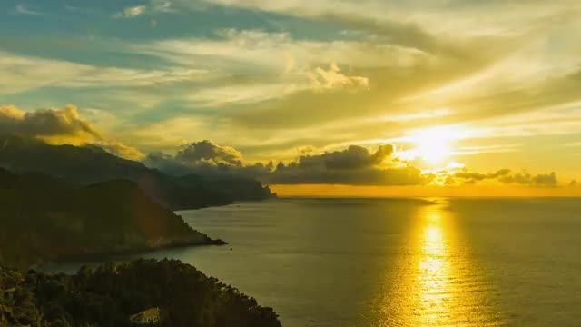 Amazing sunset over sea and cliff fishing boats Majorca spain