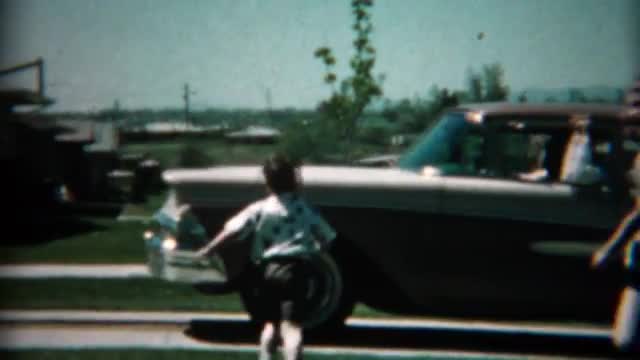 > 1961: New family car pulls into driveway for inspection by excited family.