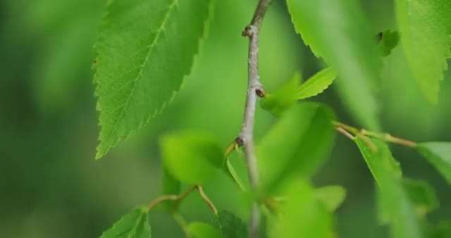 Panning above and through green leaves on a tree in the warm summer light with a shallow depth of field.