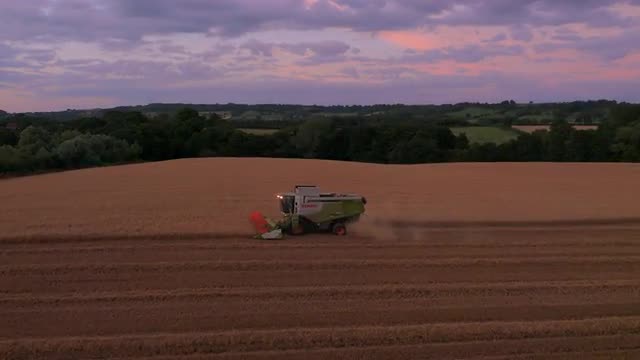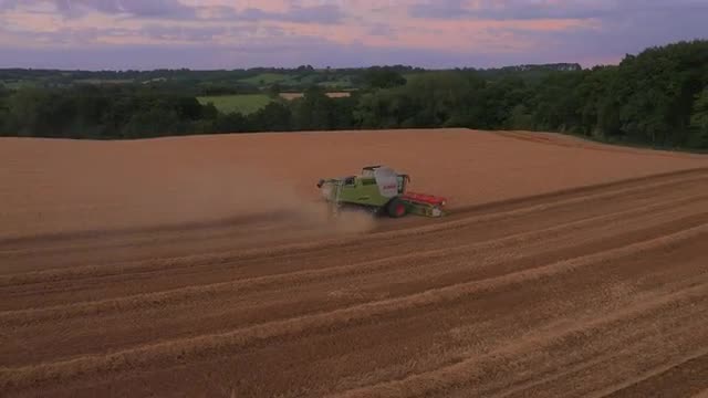 646556 - Approaching aerial drone footage of combine harvester and purple sky, UK