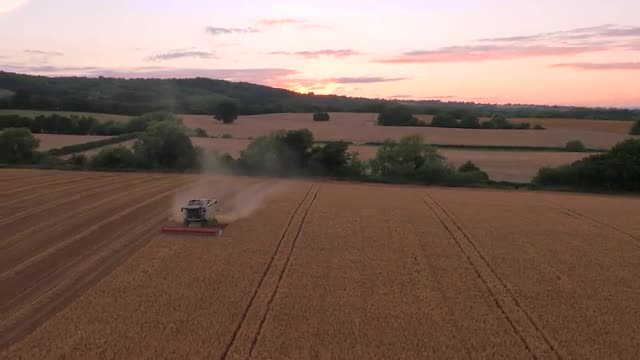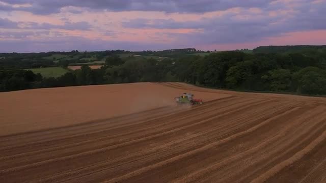 646434 - Aerial drone footage of combine harvester and stunning purple sky, UK