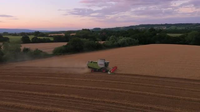 646558 - Aerial drone footage of Claas combine harvester and purple sunset, UK