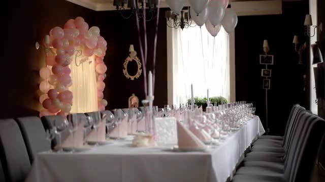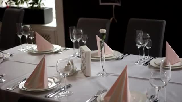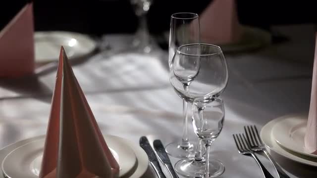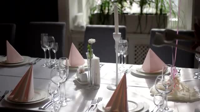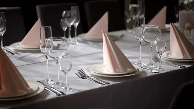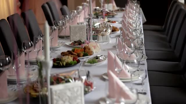 426321 - High angle shot of decorated table in dining hall