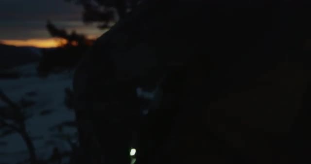 This is a 4K shot of two campers hiking up a snowy mountain during sunset.
