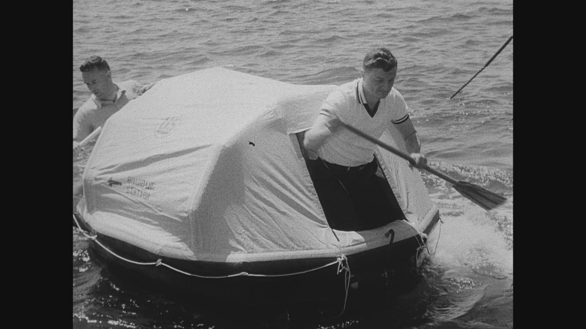 > 1955: Boy paddling on swimming raft around hotel pool. CHICAGO, ILLINOIS