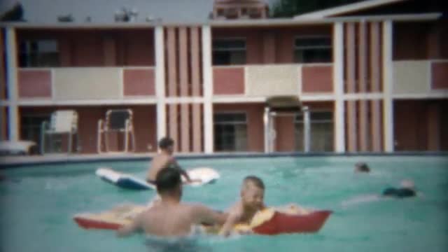 > 1955: Dad paddling raft around hotel pool playing with sons. CHICAGO, ILLINOIS