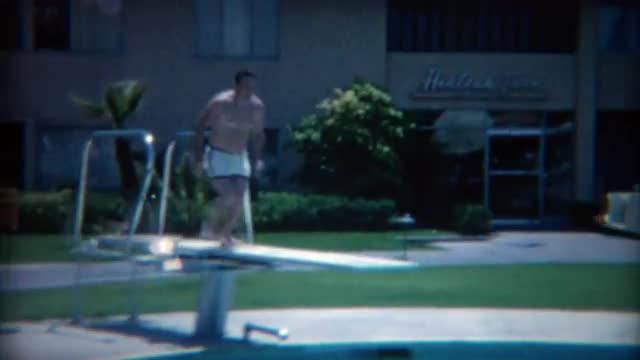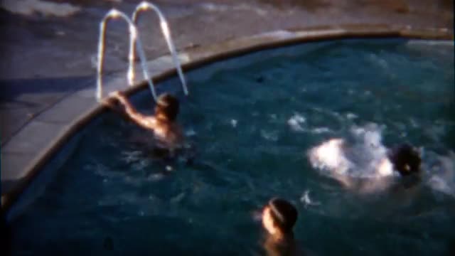 > 1955: Boys jumps and climbs out hotel pool on summer vacation. CHICAGO, ILLINOIS