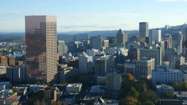 High up angle of urban financial buildings in the evening
