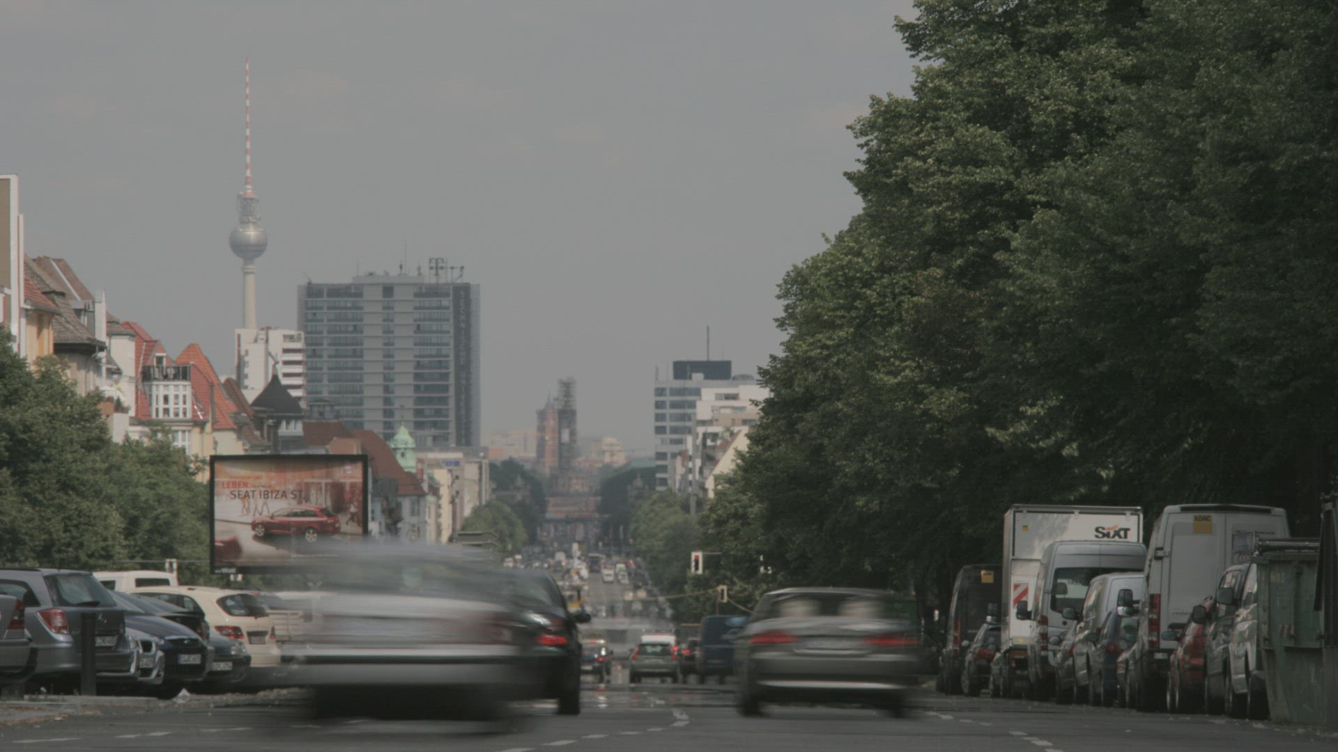 A timelapase video of dark and fast moving clouds behind the Berlin TV Tower.