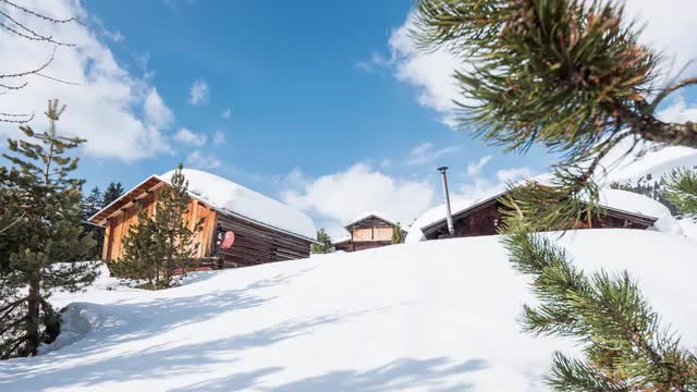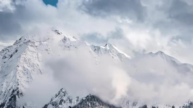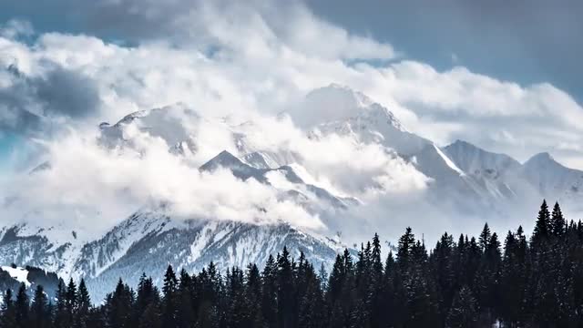 > Time lapse of clouds rising from snowy forests during a sunset in Austrian Alps
