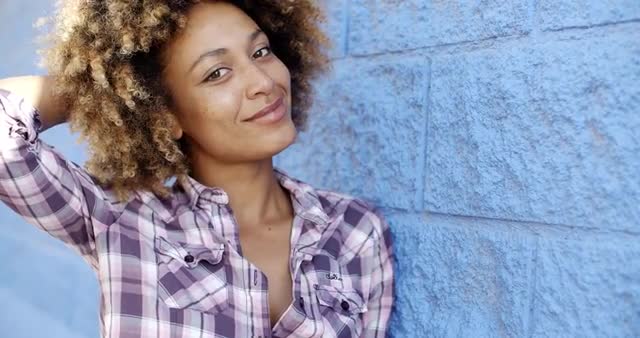 Young happy looking african american girl standing by the blue wall