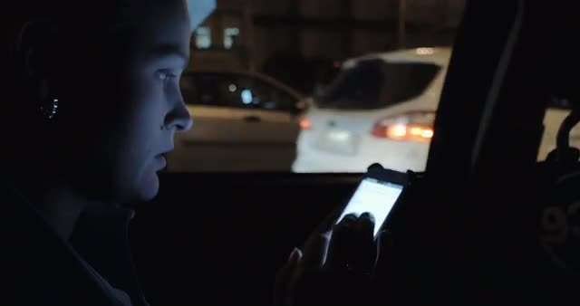 Young female using mobile phone while sitting on a road slow motion