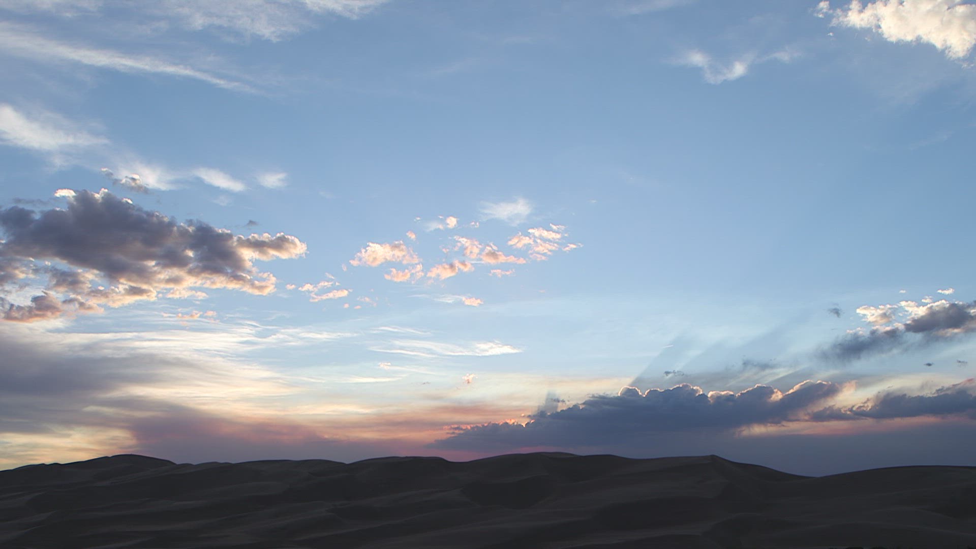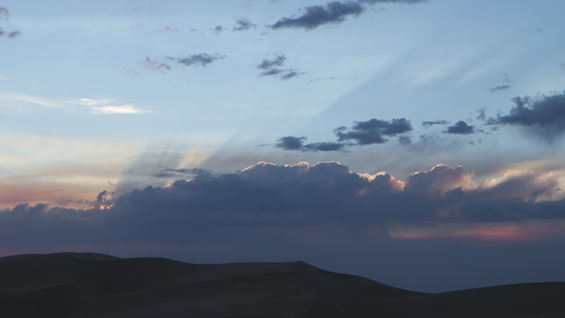 > Camera pans across sand dune as sun is about to set on horizon