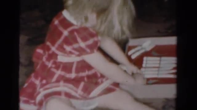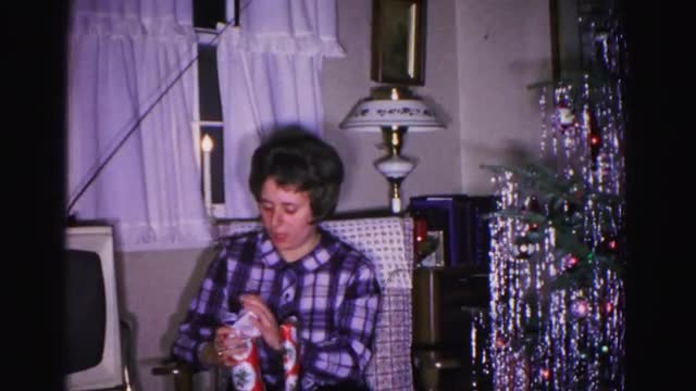 649282 - 1967: a woman carefully opening a christmas gift in her lap HAGERSTOWN, MARYLAND