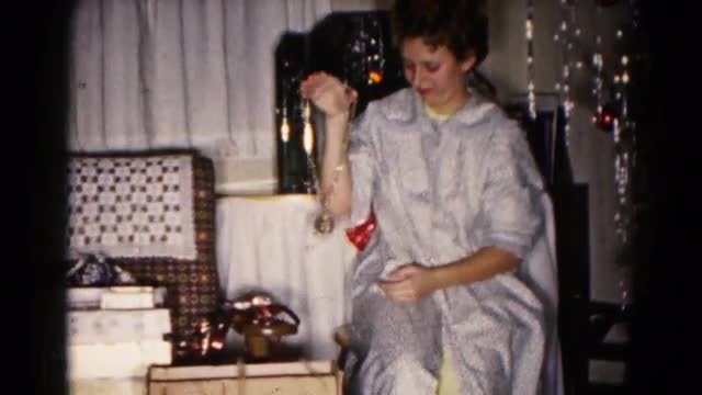 647914 - 1959: a woman in a nightgown seated on a chair opening a gift on christmas HAGERSTOWN, MARYLAND
