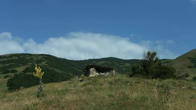 Old Hut on the Side of a Green Hill. A great piece of stock in 4k definition, perfect for film, tv, documentaries, reality TV, trailers, infomercials and more!