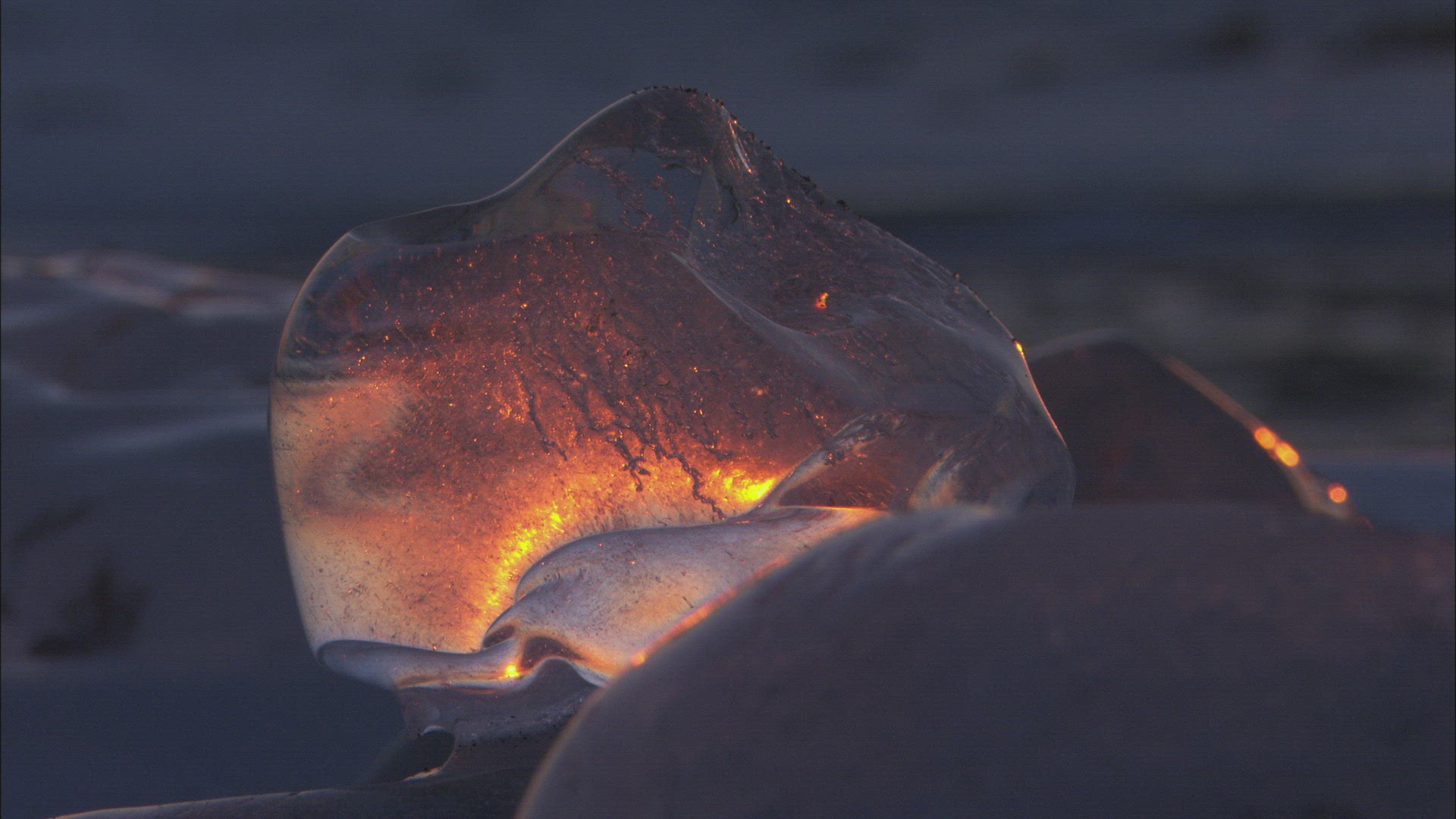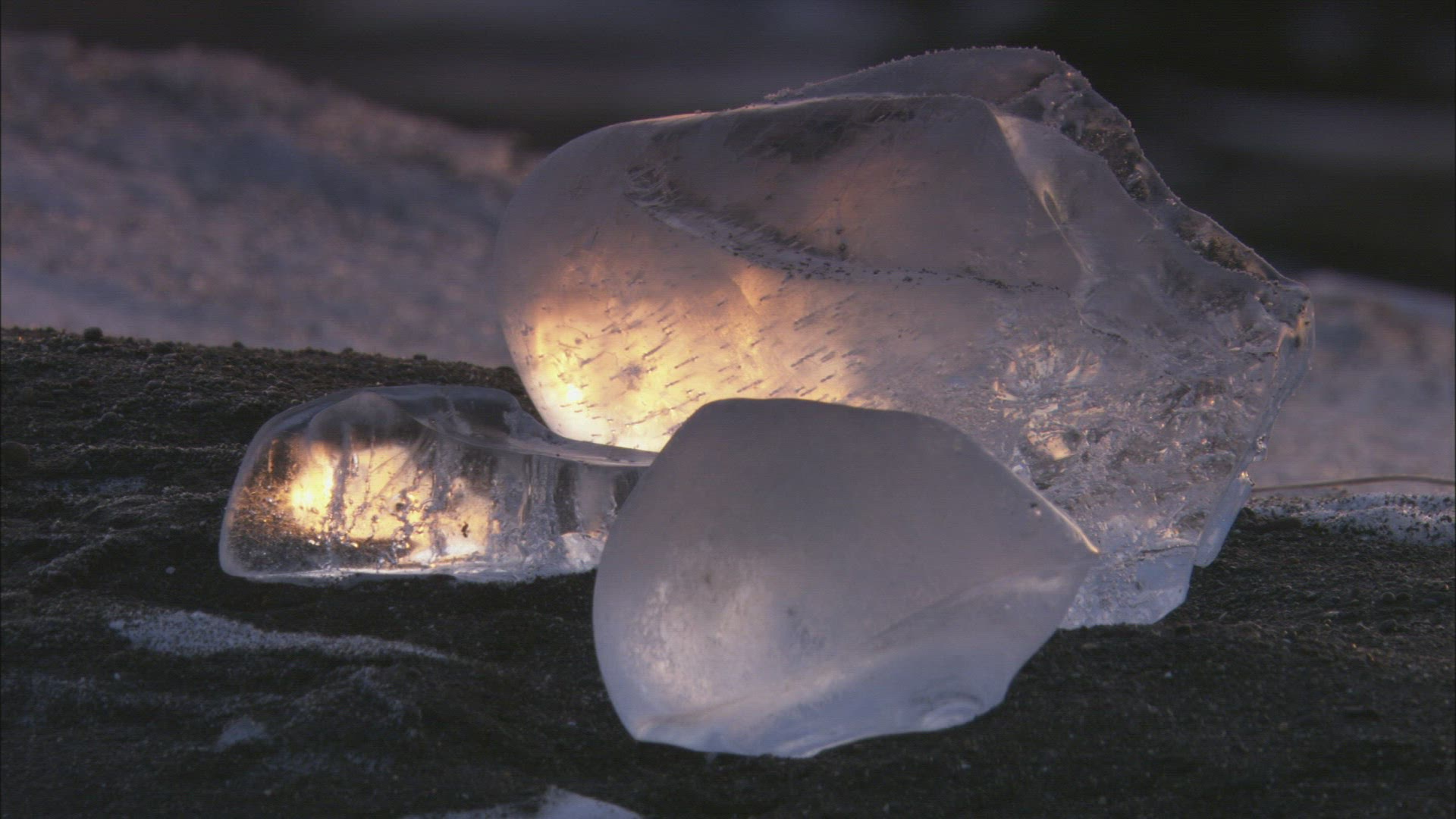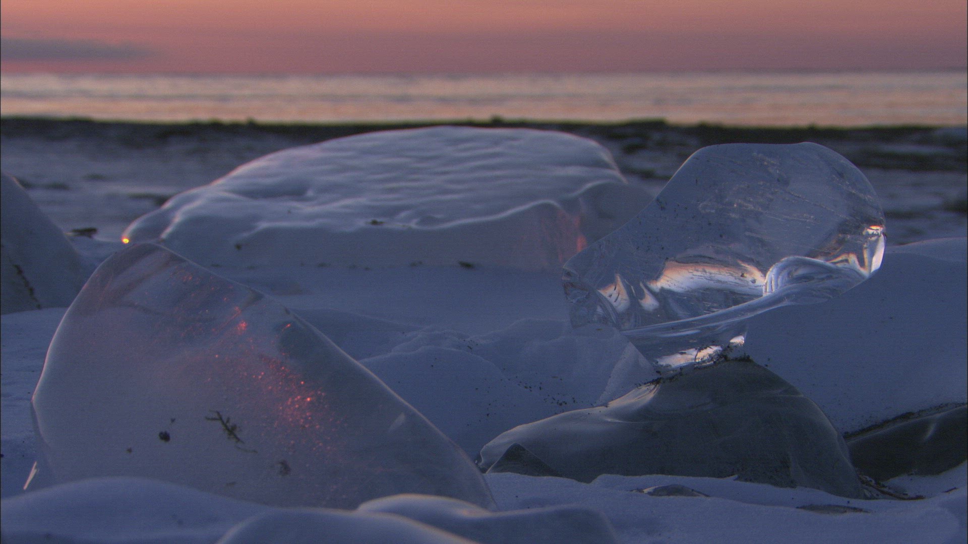 Large ice formations at dusk on frozen Lake Michigan