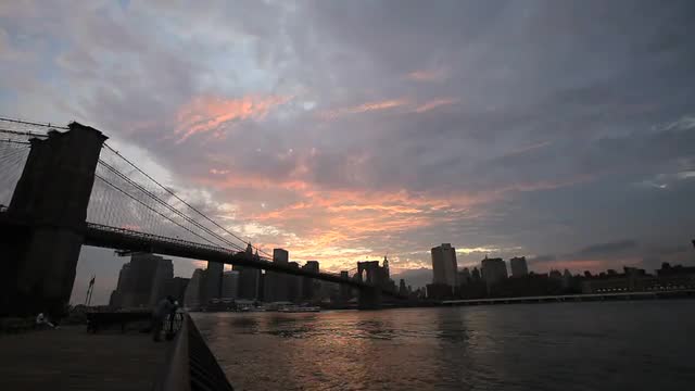 Time lapse of an epic sunset in Riga, Latvia with suspension bridge and river Daugava in foreground