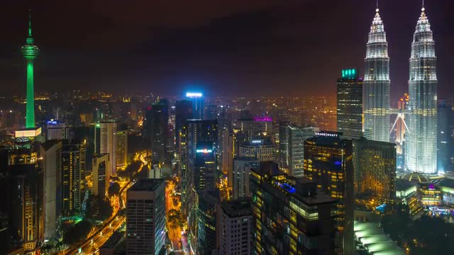 > Sunset Time Lapse of Kuala Lumpur. Petronas Twin Towers and KL tower visible.
