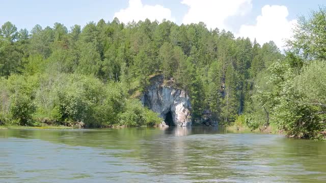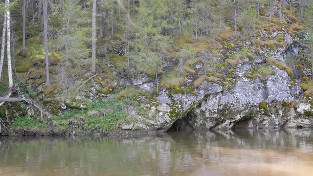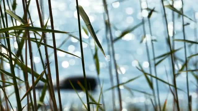 Fishing bobber on water. Yellow autumn leaves on green water. Clouds reflection in water ripples. (av5642c)