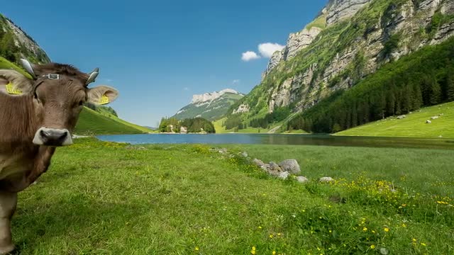 Panning view of a couple of young dairy cows grazing on lush pastures next to the lake Seealpsee with passing hikers.