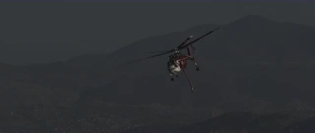 Fire Fighters in chopper flying around a fire. California tracking long shot day