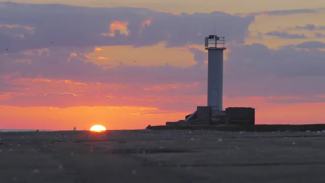 Sun setting behind a queue of bulk carriers over a calm sea, breakwater in foreground
