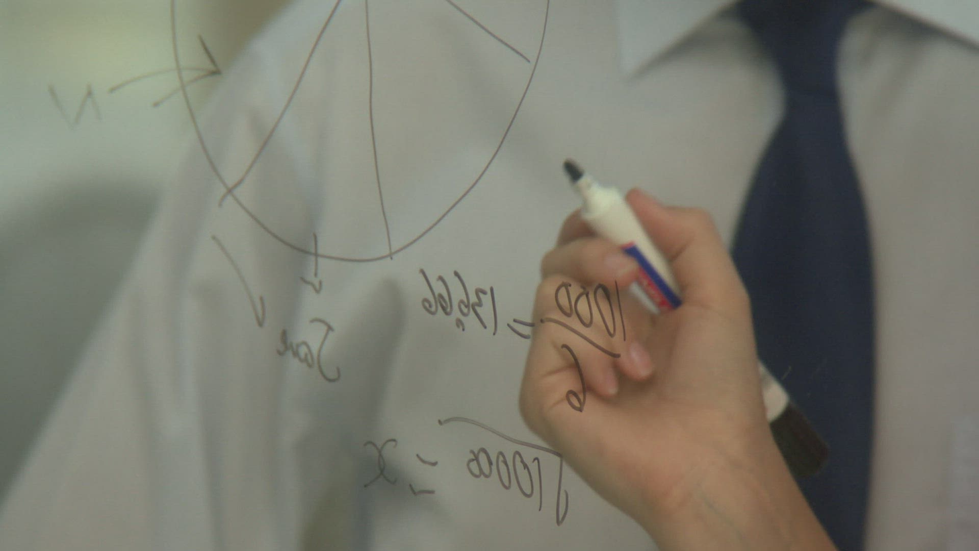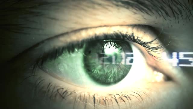 Woman trader looks at screen with stock quotes candle charts. Big black glasses, eyes closeup, reflection of the display. (av1292c)