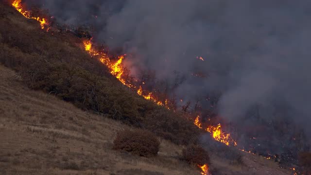 1363364 - Smoke rising from wildfire at fire retardant line on Utah mountain