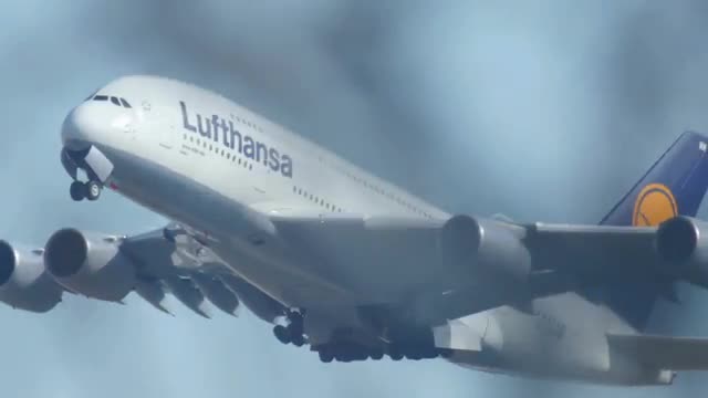 FRANKFURT AM MAIN, GERMANY - SEPTEMBER 5, 2015: Lufthansa Airbus 380 D-AIMM, taking off on runway 25C. Unofficial spotting in Fraport on Sep. 5, 2015