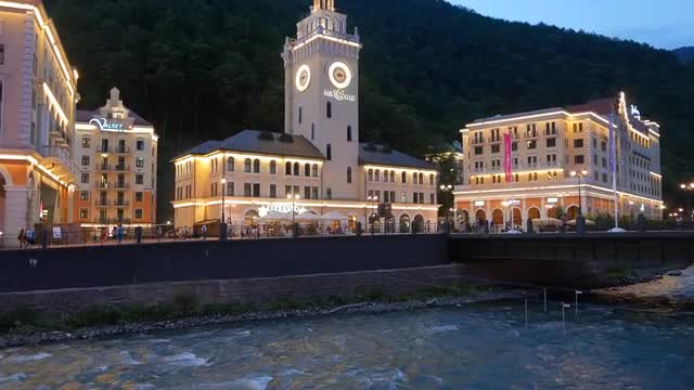 > Rosa Khutor Clock Tower in the evening, Mzymta River, Sochi, Russia. 4K